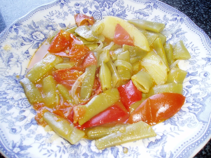Poner en una tartera la cebolla picada, encima colocamos las patatas, luego los fréjoles y a continuación el tomate, añadimos la sal, regamos con el vino y el aceite, tapamos la pota y ponemos al fuego los primeros minutos un poco fuerte para que comience a hervir y luego a fuego medio para que no se queme, pero siempre sin destapar durante más o menos veinte minutos o media hora donde comprobaremos si está todo bien hecho.