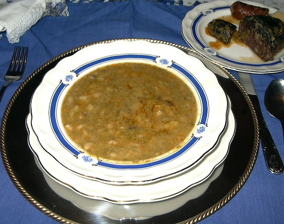 En otra pota ponemos a cocer con agua fría las fabas que están a remojo desde la noche anterior con el embutido al que también si se quiere se puede dar un hervor primero para que no tenga mucha grasa, no tiraremos esa agua por si se necesita luego añadir un poco si lo vemos muy soso.
